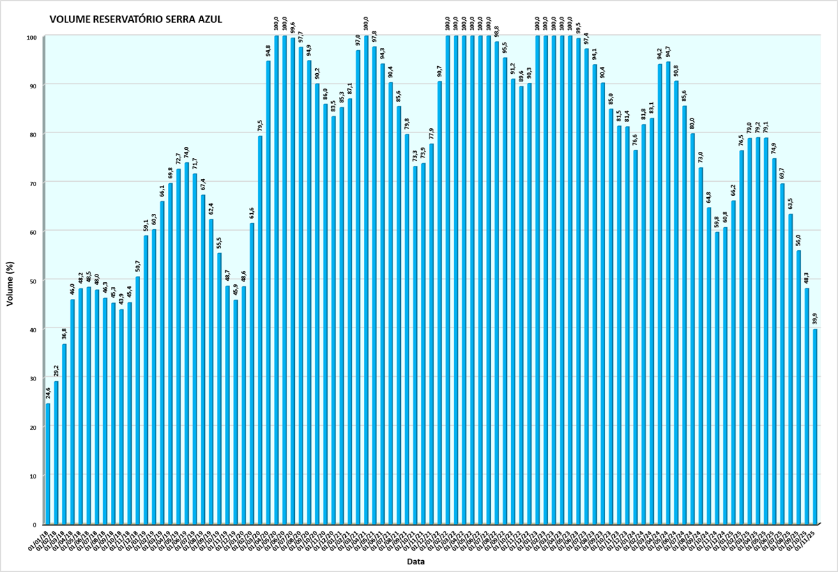 Volume do reservatório Serra Azul mês a mês entre 2018 e 2025