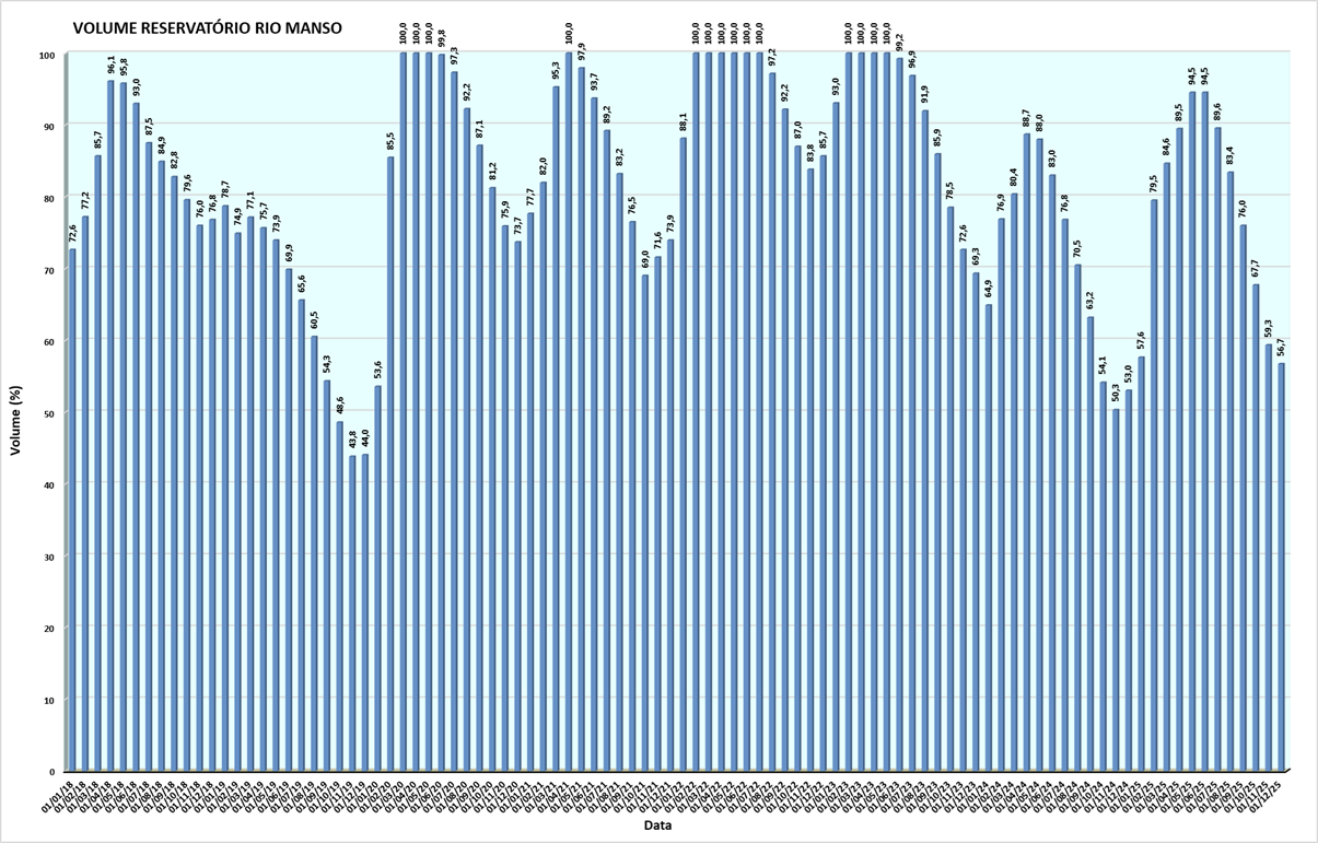 Volume do reservatório Rio Manso mês a mês entre 2018 e 2025