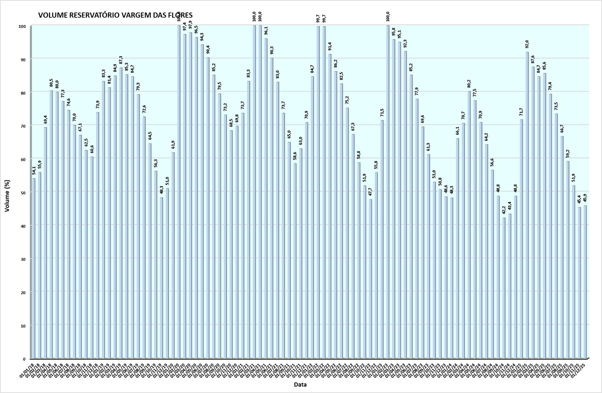 Volume do reservatório Vargem das Flores mês a mês entre 2018 e 2025