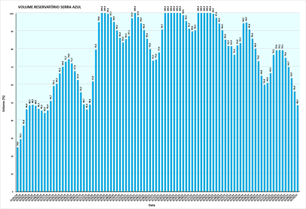 Volume do reservatório Serra Azul mês a mês entre 2018 e 2025