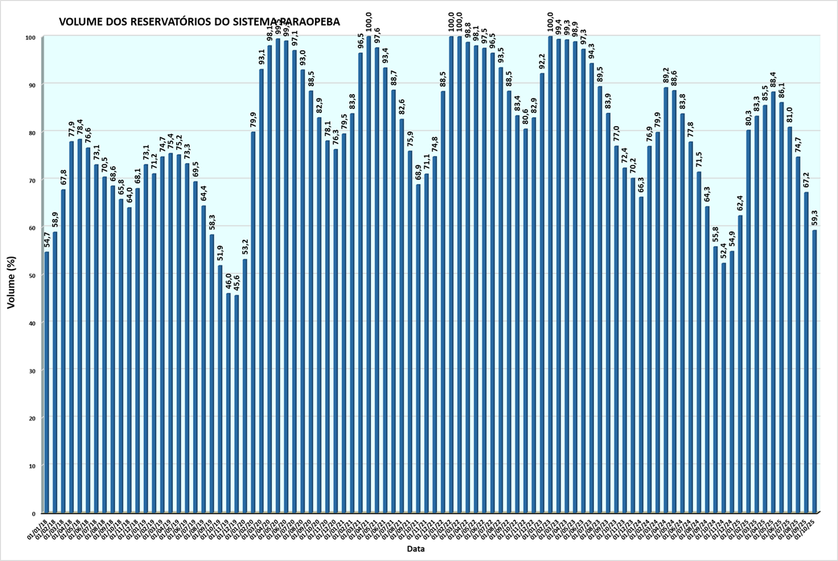 Monitoramento mensal dos volumes de água por reservatório entre 2018 e 2025