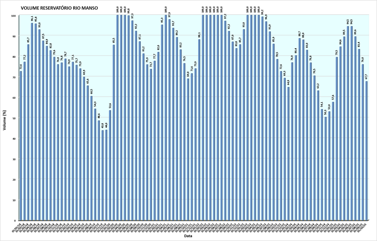 Volume do reservatório Rio Manso mês a mês entre 2018 e 2025