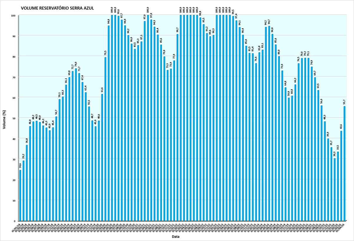 Volume do reservatório Serra Azul mês a mês entre 2018 e 2026