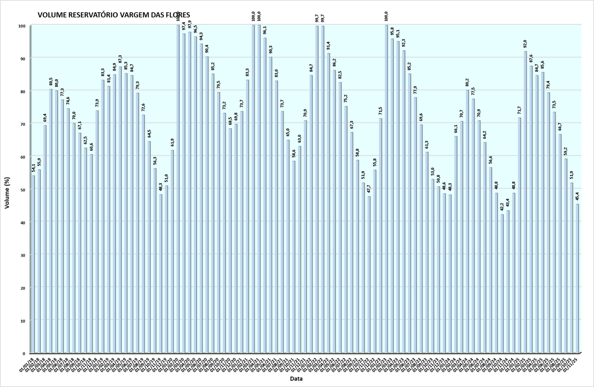 Volume do reservatório Vargem das Flores mês a mês entre 2018 e 2025