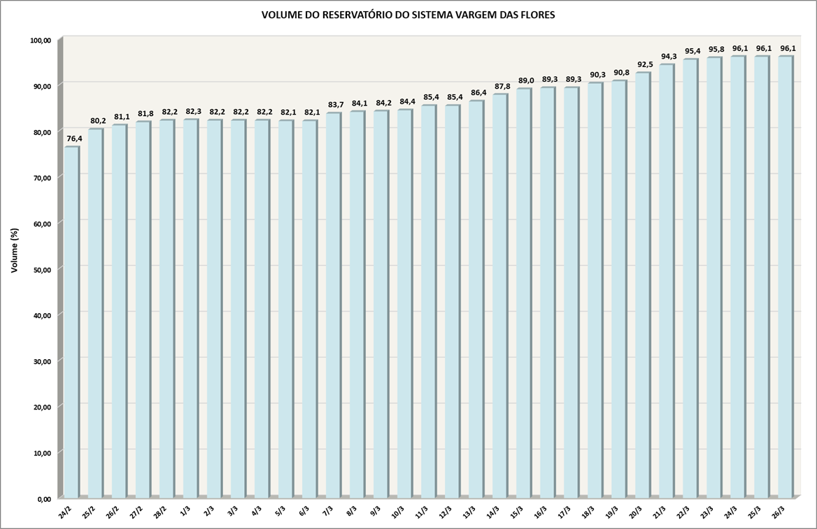 Volume do reservatório Vargem das Flores mês a mês entre 2018 e 2026