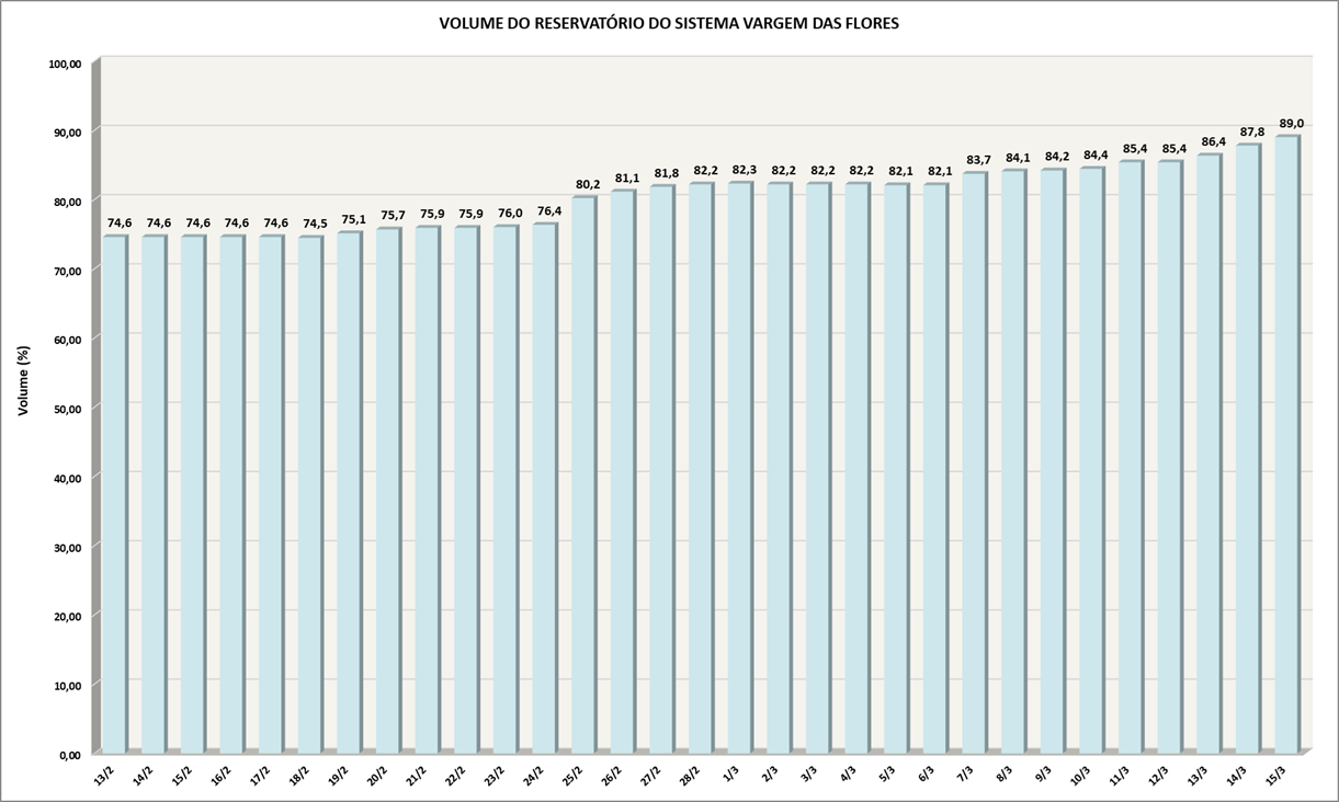 Volume do reservatório Vargem das Flores mês a mês entre 2018 e 2026